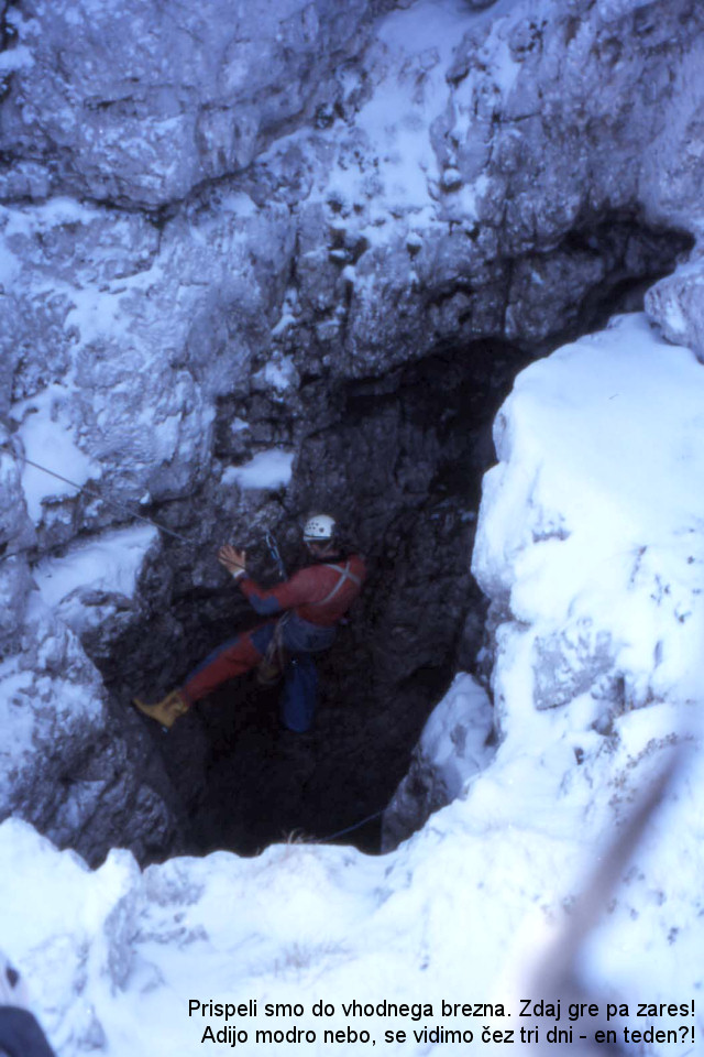 Nato je prišel dolgo pričakovani 24. november, ko se je začela devetdnevna akcija. Po predhodnih petih obiskih v Čehih 2 in obilo kondicijskih pripravah smo bili Postojnčani psihofizično odlično pripravljeni in vodilni pri nadaljnjih raziskavah. V soboto smo trije pomagali nesti opremo na hrib in se vrnili domov ter vsi skupaj odšli v Bovec v ponedeljek 26. novembra. Že takoj ni šlo brez zapletov, saj smo se morali iz Razdrtega vrniti v Postojno, da smo spravili v pogon avto Marinškovi ženi, a nam ni bilo težko uloviti ostalih, saj je Premrlu še pred Tolminom spregel avto. To nas nikakor ni spravilo v nejevoljo in popoldne ob treh smo se že spustili v jamo. Prvi smo se spravili spat na -900 že okoli devetih, za nami pa sta prišla še Lojz in Bojan. Lojz je občudoval razsežnosti bivaka in ves navdušen skakal okoli, medtem ko je Bojan, že precej zaspan čisto resno dejal: »Jst si bom pa šotor rajši pugledu zjutri, ku bo svtlu«. Vsi smo planili v smeh, tudi Bojan, ko se je zavedel svojih besed in še dolgo smo ga zbadali na račun »jamskega sonca«.