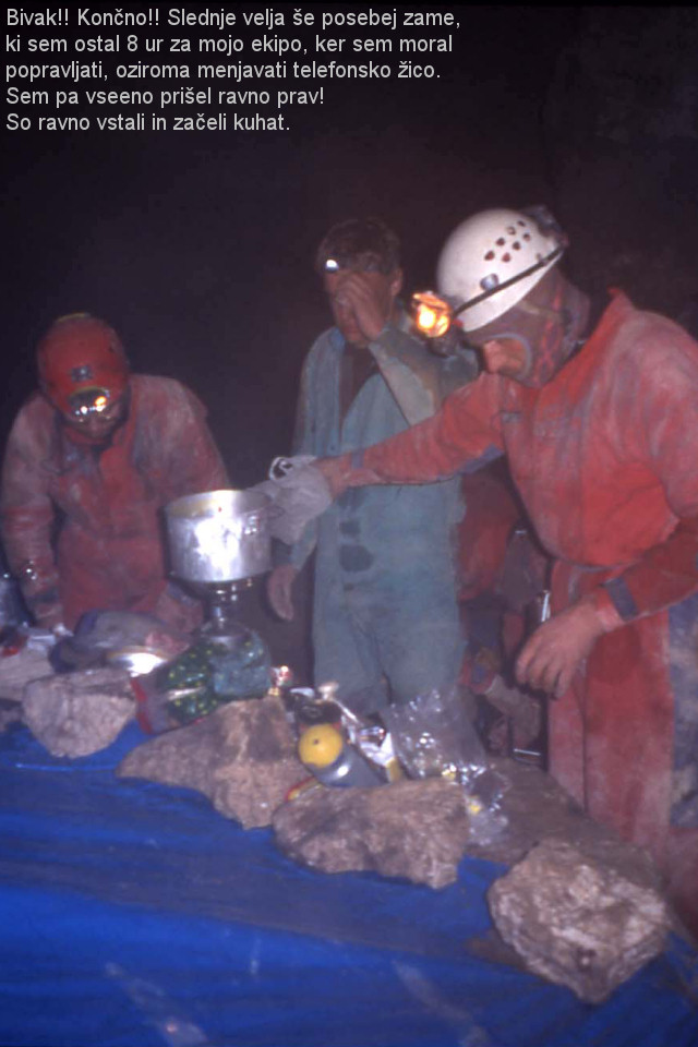 Tudi spanje v jami nikakor ni preprosto. Spalna vreča, v vlagi in temperaturi malo nad ničlo, lepo greje dokler je suha in ne greš vanjo moker, vendar so se spalke že kmalu navlažile in zasvinjale, tako da smo na koncu spali že v pravi plesni in smradu. Prehranjevanje je sploh problematično. Navadno forsiraš po jami brez postanka in piješ le mrzlo vodo, nato pa poješ kar ti pride pod roko. Na eni izmed akcij smo si v krompirjev golaž zdrobili napolitanke, ker se nam je zdel preredek, kruha pa ni bilo. Takrat se mi je to zdelo odlično, sedaj pa me kar malo zvije, ko pomislim na to kombinacijo. A v življenju se kmalu pozabi na težave in neprijetnosti ter od vsega skupaj ostanejo le lepi spomini, ki jih je bilo na teh akcijah kar precej.