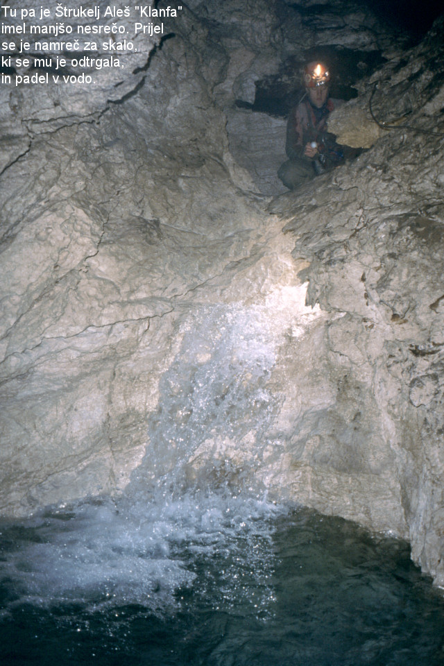 Okoli dvanajste, ko smo uredili zunanji tabor, se je naša pisana druščina podala v jamo. Na vhodni vertikali smo srečali Palčičevo borovniško-rakovško ekipo, ki je izgledala še bolj klavrno od nas. V jamo so spuščali transportke z opremo, a se jim je delo precej zatikalo. Morda je bilo krivo to, da je Klanfa pri opremljanju izpustil par svedrovcov, ali pa jim je primanjkovalo spanja, saj so pol noči porabili za iskanje tabora v megli prejšnji večer. Njihovo delo v jami smo nadaljevali mi in šele zvečer smo se vrnili na površje ter zaužili malo tople juhe. Nastala je dilema, ali jo popihamo v dolino in rinemo domov, ali pa se naspimo in takoj zjutraj poskusimo priti v dolino pred prihajajočim dežjem. Odločili smo se za slednjo varianto, a žal bili petnajst minut prepozni in nas je pred Krnico pošteno spralo. Dež je tako postal naš stalni spremljevalec še na nekaj naslednjih akcijah. Vsi premočeni smo se zbasali v avte in se zapeljali do Alp hotela, kjer smo bili pod nadstreškom glavna atrakcija za mimoidoče, ko smo nagi skakali okoli in iskali koščke suhe obleke. Druge vrste mokrota pa je bila kriva, da smo namesto običajnih dveh ur, v Postojno potovali do večera, saj smo si pobliže ogledali vsako obcestno gostilno.