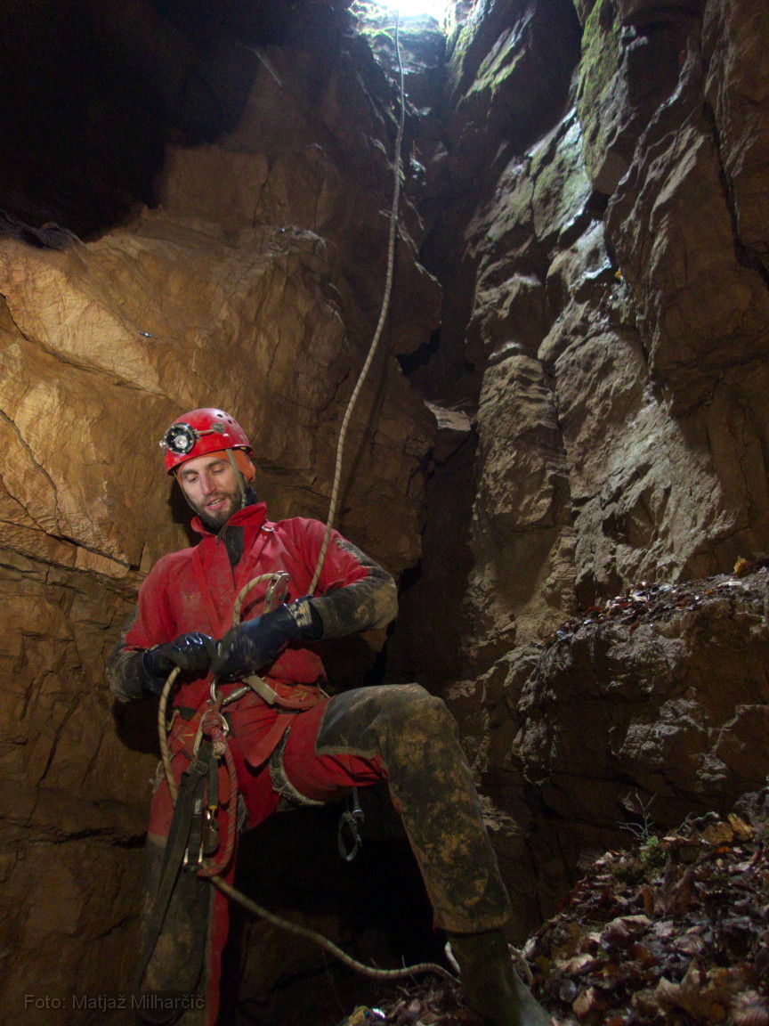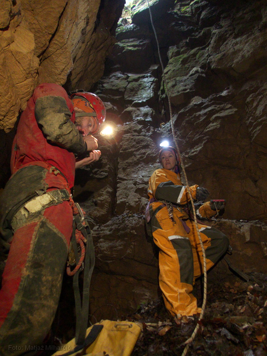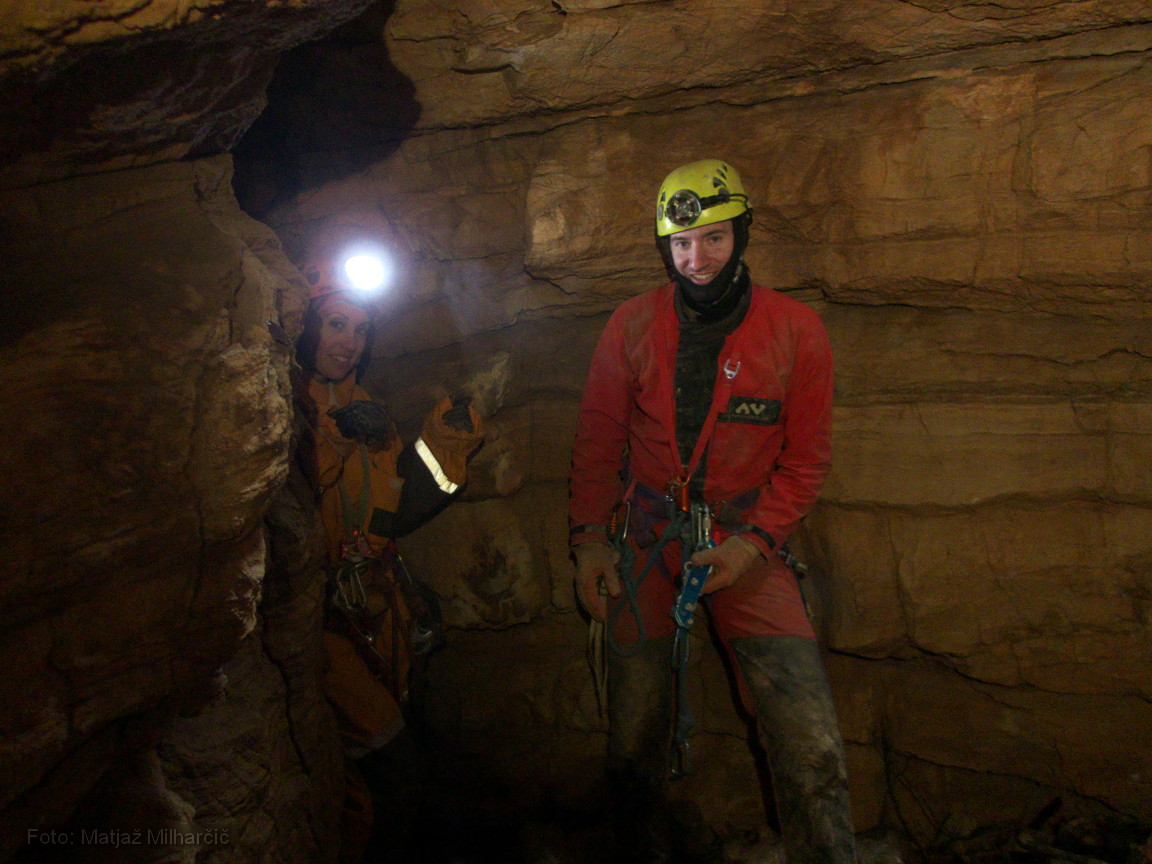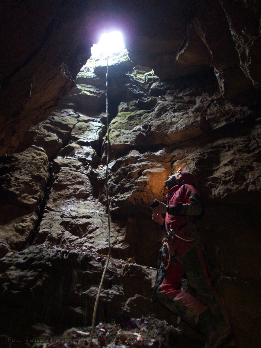 Ko smo se vrnili z opremo in se pustili v jamo, se nam je tisto malo upanja, ki smo ga imeli v globljo jamo razblinilo. Jama se sicer tipično zvonasto razširi, a žal se s tem tudi konča. Obstaja sicer možnost da bi pozimi zasledili kakšen prepih iz kakšne špranje... bomo videli. Zaenkrat smo namerili 12m poligona. V jami smo bili Vid, Matej, Tinkara in Matjaž.