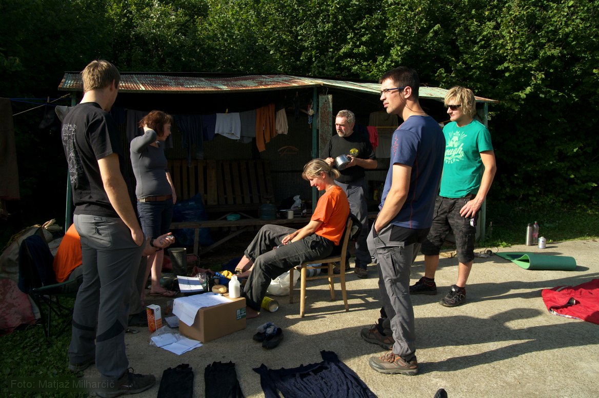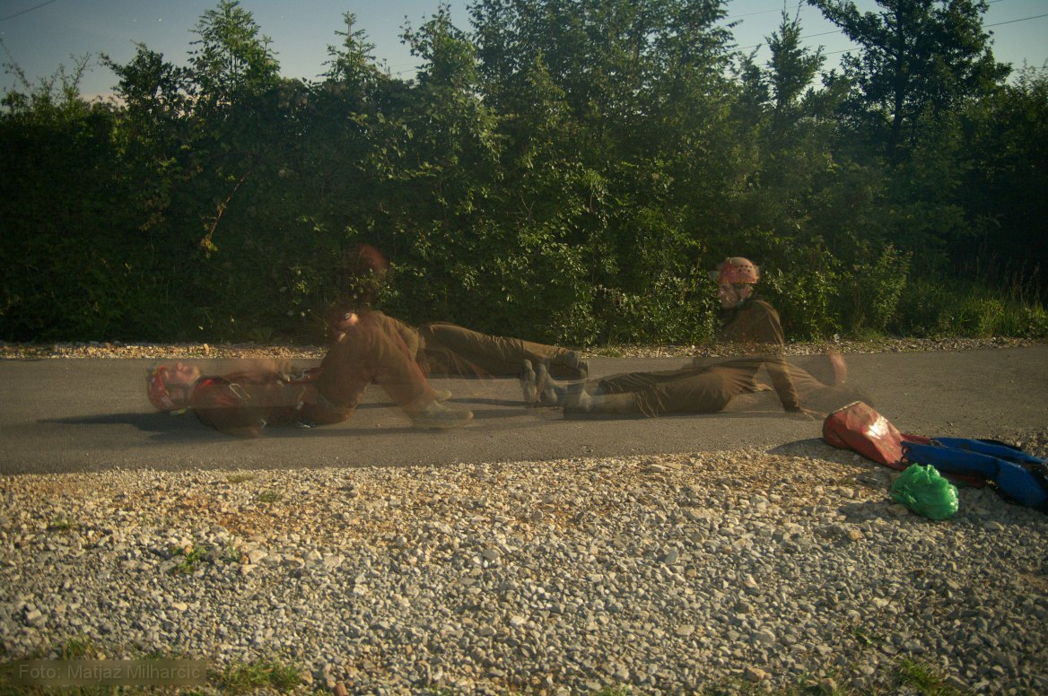 Third international caving expedition took place in Kačna Cave this year. The cave has good potential for the longest cave in Slovenia. Explorers were mostly Czech cavers that arrived in town Divača on 30th July. This years expedition was rather successful as they made a major break through. They dived through a 400m long siphon II at the end of "Rov za zrcalom" (shaft behind the mirror). After this siphon there is a dry part followed by a 90m siphon III and after that another dry part. They stopped at siphon IV. Members of JD Rakek and DZRJ Luka Čeč joined to help on Saturday 13th August.