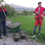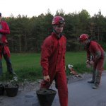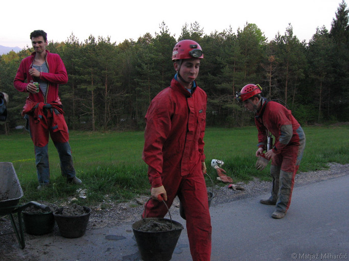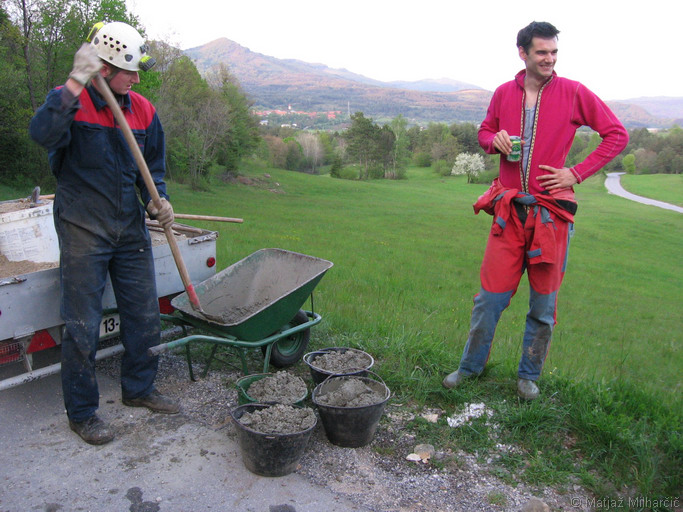 Glede na to, da smo prehod skozi podor trikrat širili, pa se še vedno ne počutimo varno, smo se odločili, da ga ojačamo z armiranim betonom oziroma podpornim zidom (škarpo). Tomaž je pripeljal surovine in orodje. Beton smo mešali na roke v samokolnici.