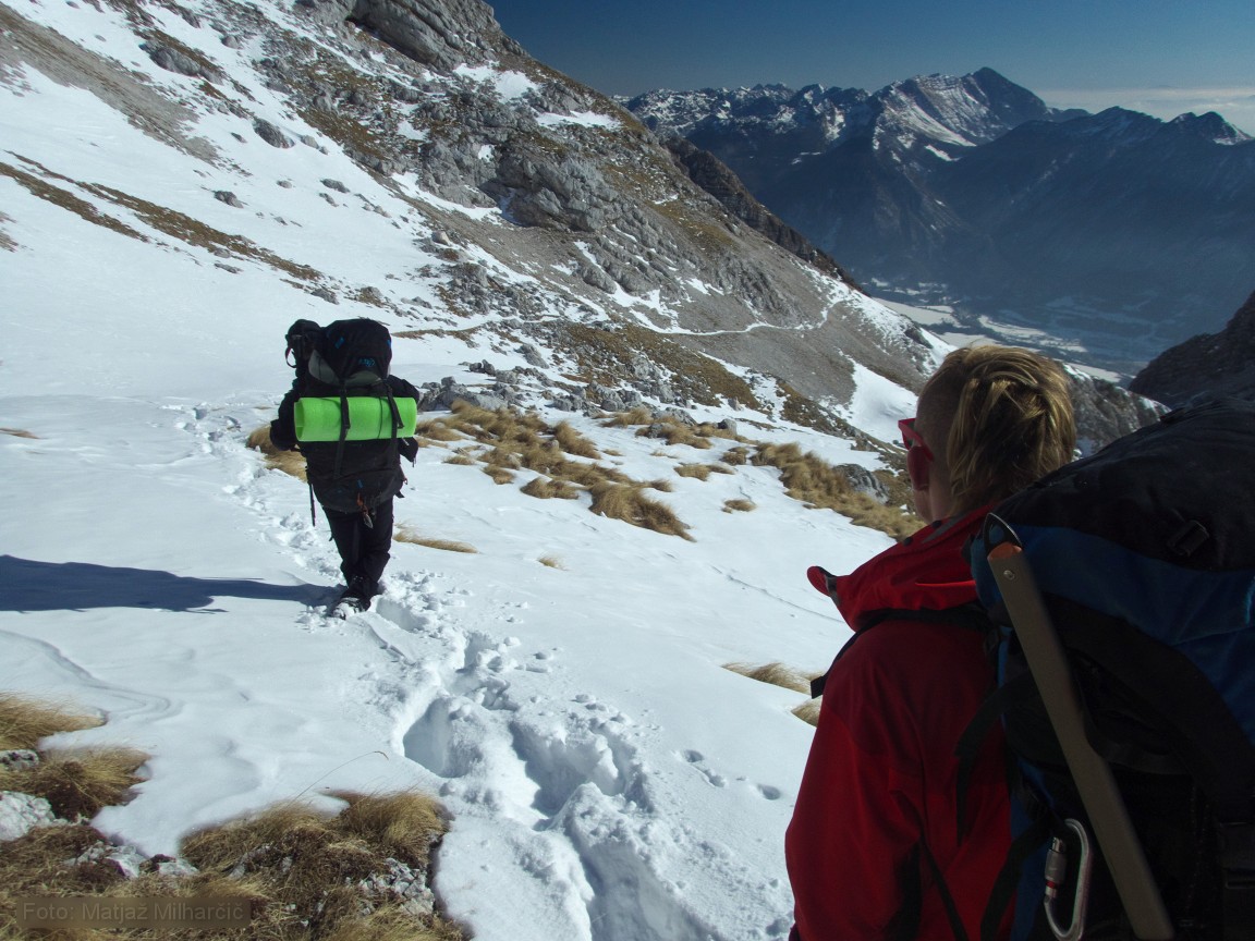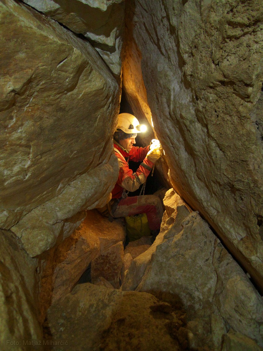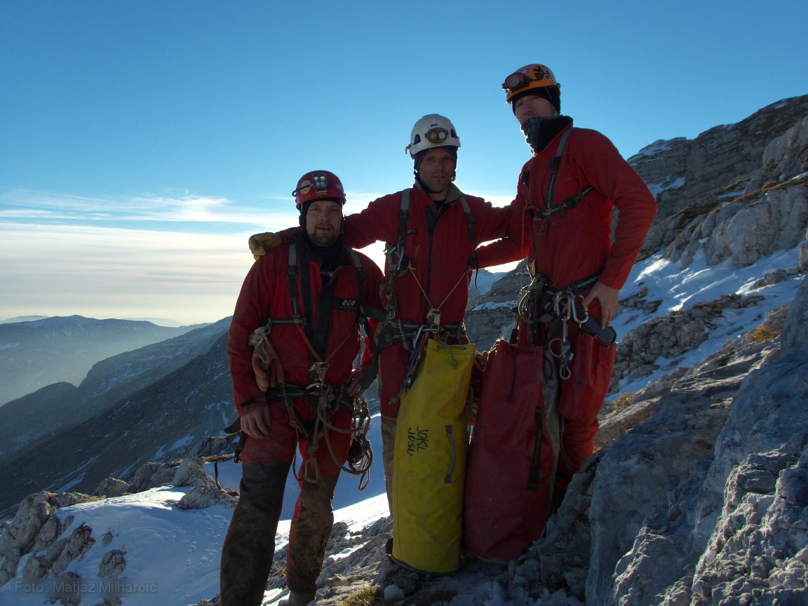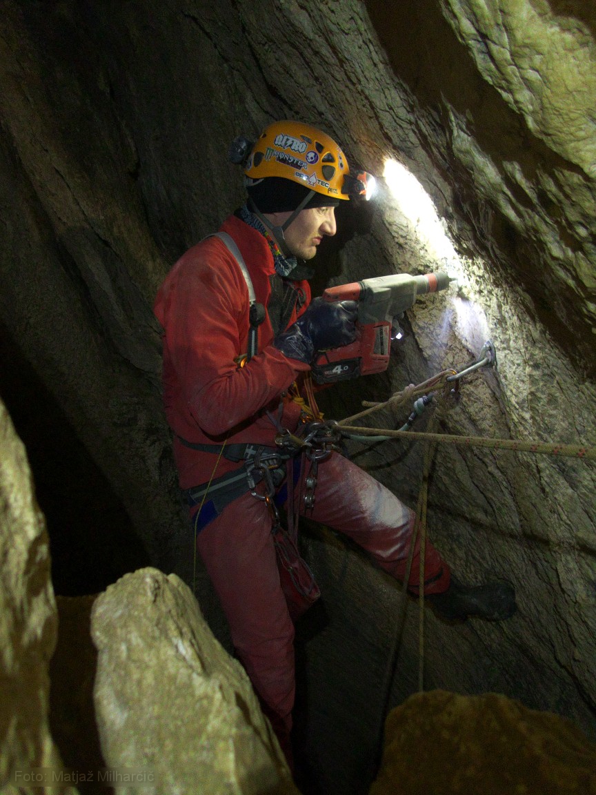 Past weekend explorations were going on in abyss Hudi Vršič. Mršek, Klanfa and Ana went up there on Friday evening. It took them seven hours to arrive to the cave and at three in the morning they finally left the surface. Marjan, Jokl and Matjaž gatherred in Bovec on Sathurday morning took the sky lift to Prevala and descended in the cave at four in the afternoon