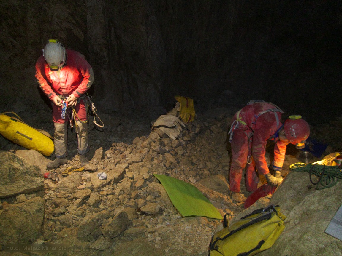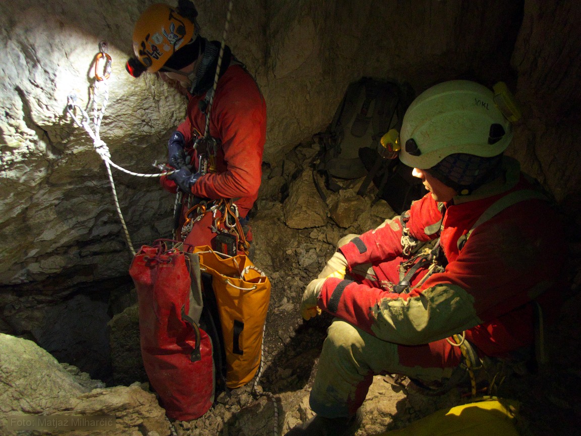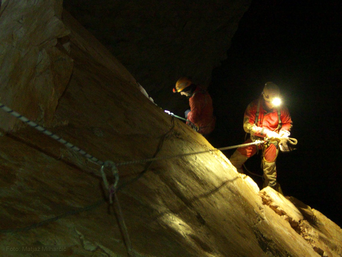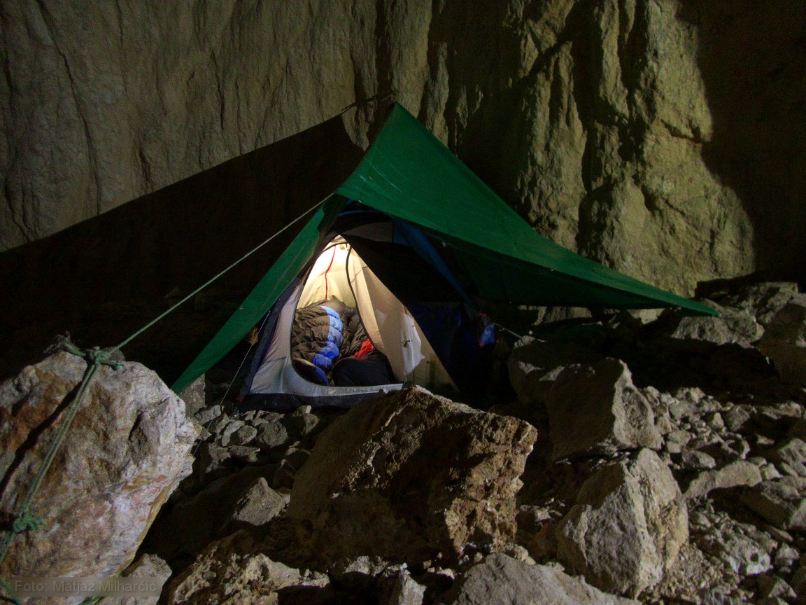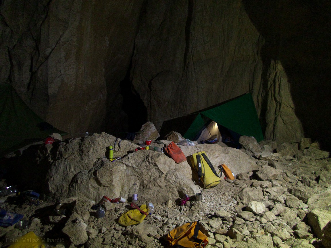A 400m piece of rope was at the bottom of the first abyss and we took it to replace the worn out rope. While doing it we also added or replaced few anchors. By two in the morning we used almost all rope and descended to bivouac at -400m. At six in the morning we had to get up as me and Marjan were planning to catch last sky lift to the valley while Jokl descended further to the bivouac at -800m. Just before we took off Ana arrived at bivouac at -400m and Klanfa was not so far behind.