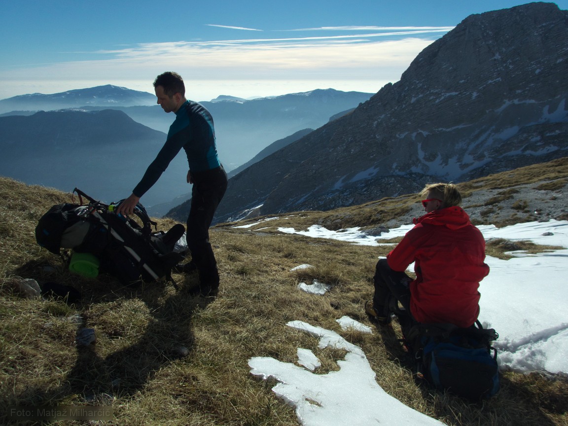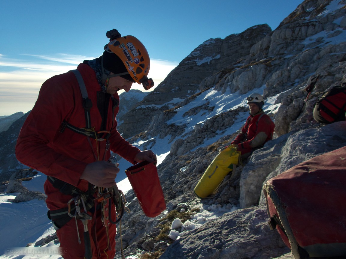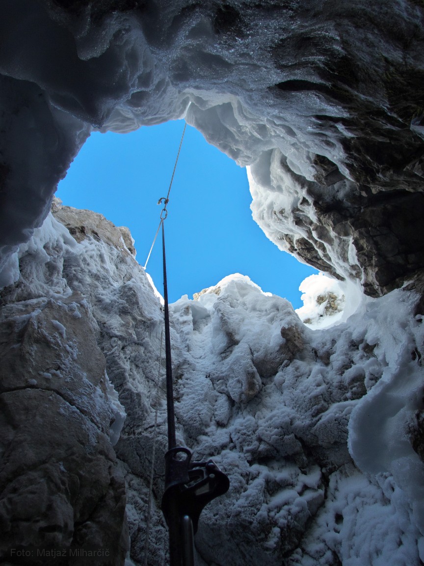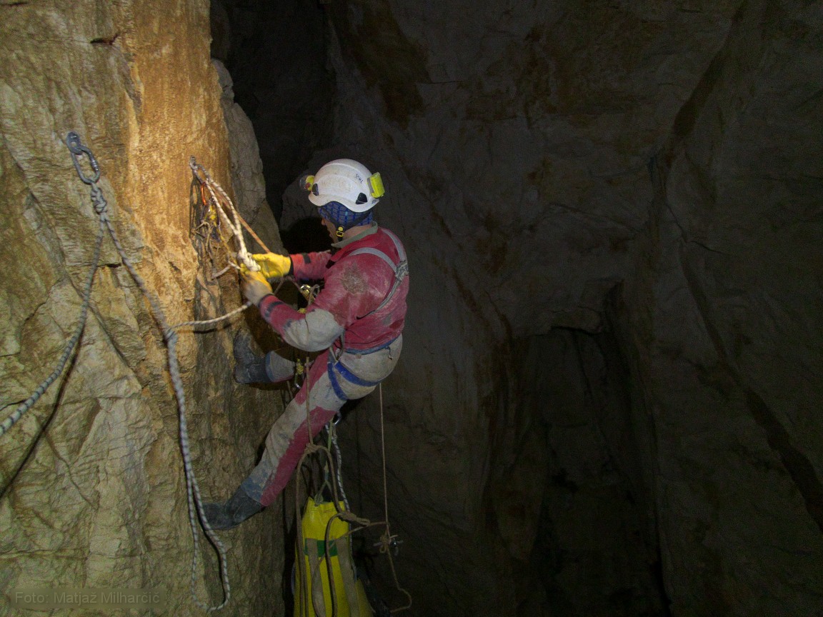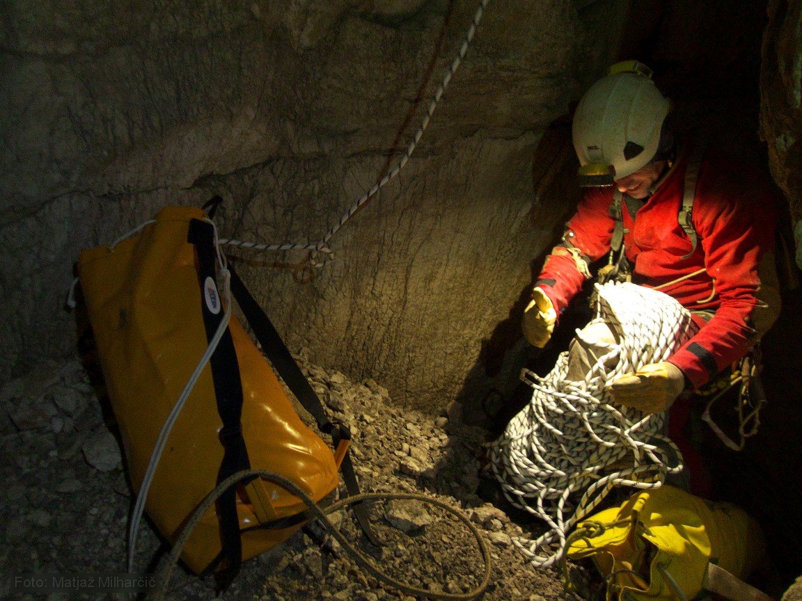 A 400m piece of rope was at the bottom of the first abyss and we took it to replace the worn out rope. While doing it we also added or replaced few anchors. By two in the morning we used almost all rope and descended to bivouac at -400m. At six in the morning we had to get up as me and Marjan were planning to catch last sky lift to the valley while Jokl descended further to the bivouac at -800m. Just before we took off Ana arrived at bivouac at -400m and Klanfa was not so far behind.